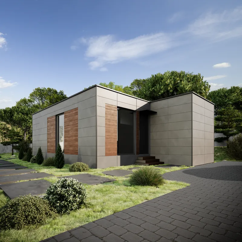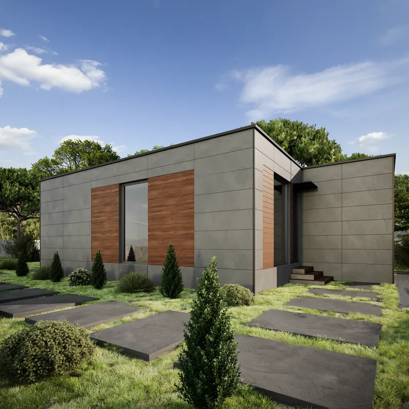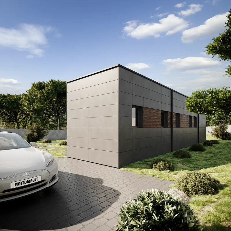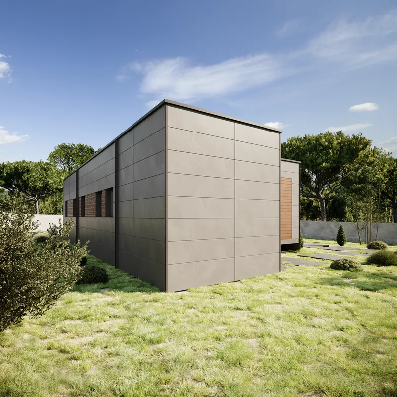 - Façana ventilada acabada amb diferents opcions: amb plaques de fibrociment de la marca NICHIHA, que garanteix zero manteniment, fusta termo tractada o xapa grecada. Es poden combinar els diferents materials per aconseguir un disseny únic i personalitzat. (color a escollir)