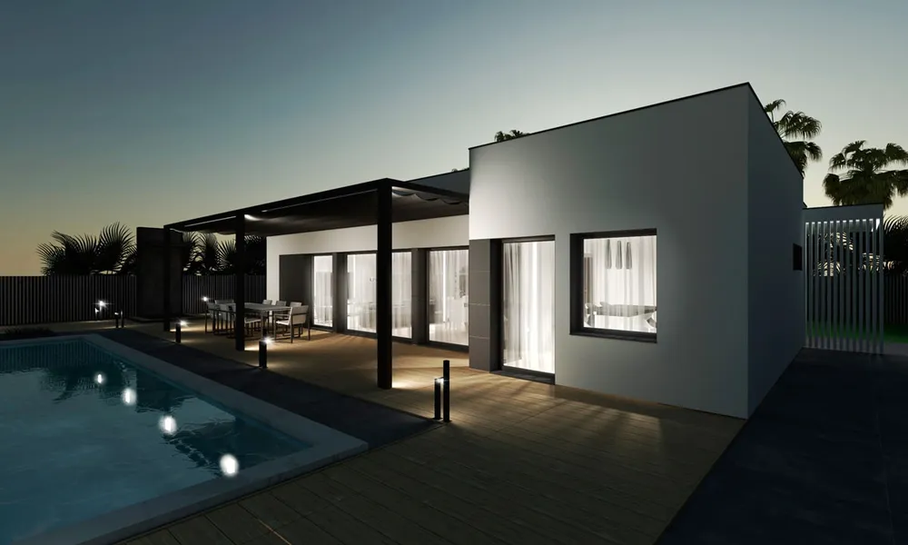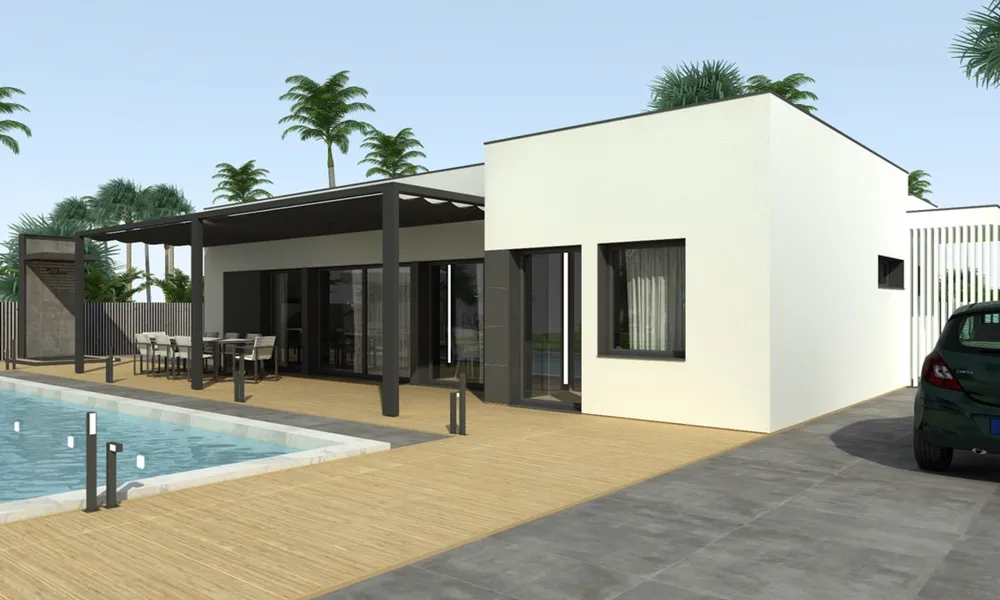 Esta casa prefabricada brinda las prestaciones para vivir a lo grande. Distribuye los 145, metros cuadrados útiles en dos plantas, tres dormitorios y dos baños. Este modelo tiene una excelente distribución para una familia numerosa. Opcionalmente, se puede instalar un porche para crear una zona acogedora en frente de la piscina.